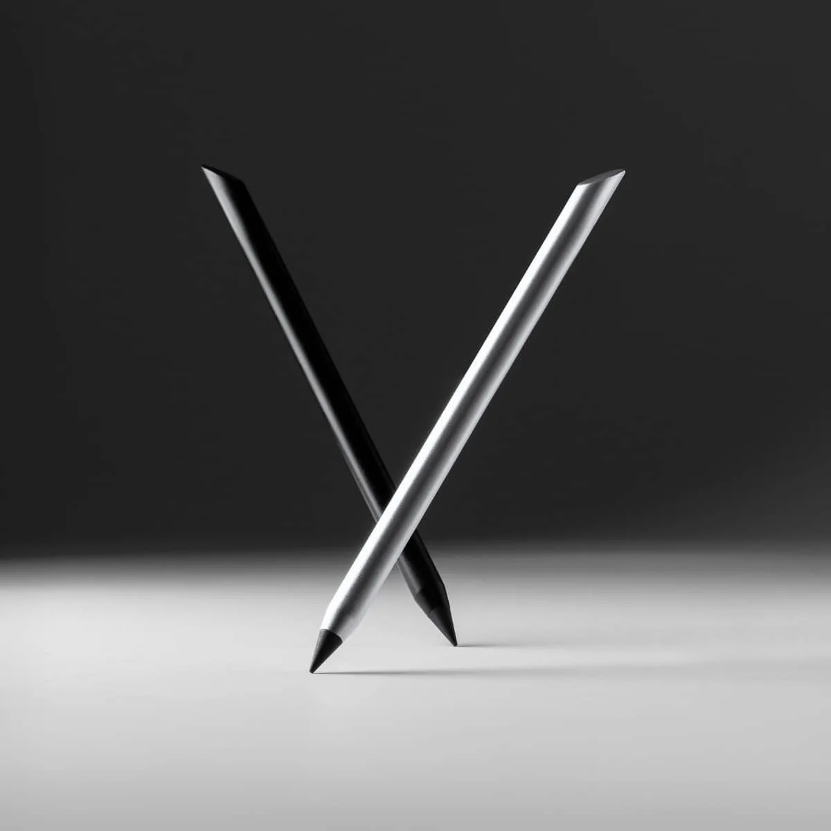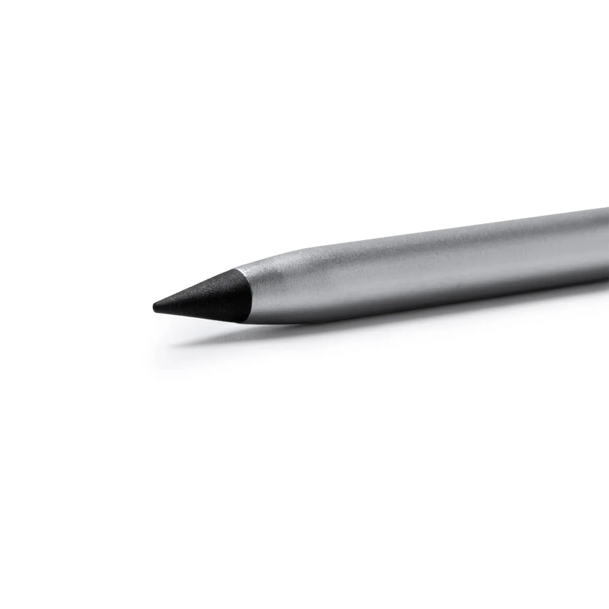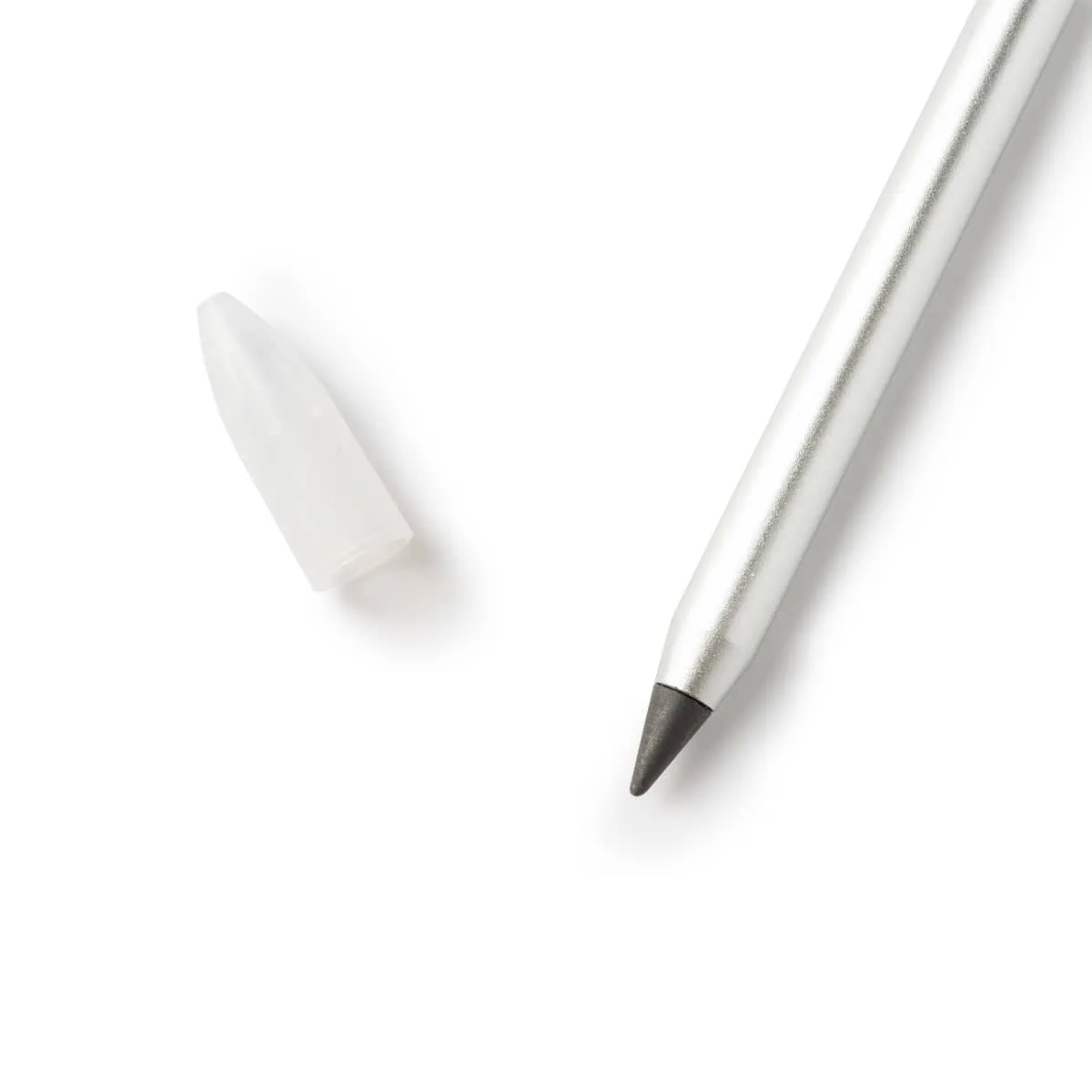 Lápiz con cuerpo de aluminio. Punta de grafito de escritura infinita intercambiable. No es necesario sacarle punta.