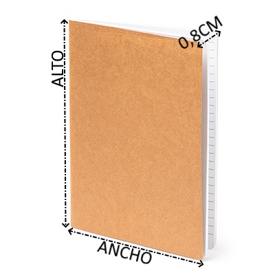 Libreta A5 con tapas elaboradas en cartón reciclado y 60 hojas de rayas. Cuenta con un original acabado cosido en su lomo, dotándola de un acabado totalmente ecológico.