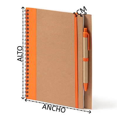 Libreta con espiral y tapa rígida de cartón reciclado. Incluye bolígrafo a juego con tinta azul. 60 hojas lisas.
