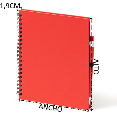 Libreta con espiral, compuesta por 70 hojas de papel liso y soporte para bolígrafo. Tapas rígidas y bolígrafo de cartón reciclado a juego.