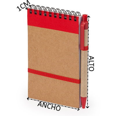 Libreta con espiral y tapa rígida de cartón reciclado. Incluye bolígrafo a juego con tinta azul. 70 hojas.