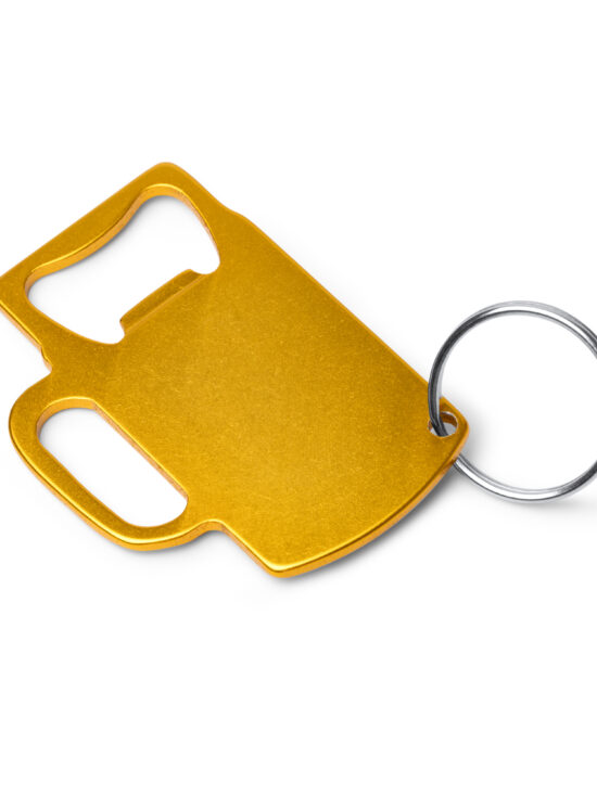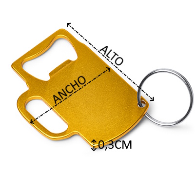 Llavero abridor elaborado en aluminio reciclado con diseño en forma de jarra de cerveza.