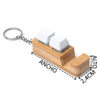 Llavero elaborado en bambú con soporte para smartphone y función antiestrés. Su diseño cuenta con botones tipo teclado en blanco que pueden pulsarse y utilizarse como medio antiestrés.