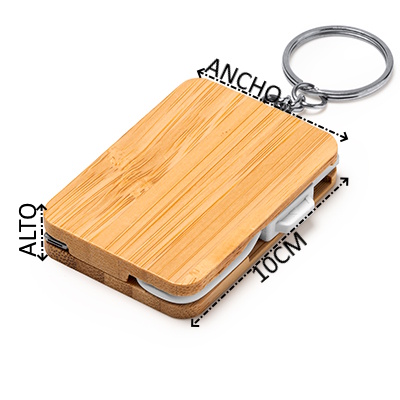 Cable cargador 4 en 1, con cuerpo realizado en bambú. Cuenta con cable Tipo C de entrada y salida y conectores USB y Lightning. Los cables son encajables en las ranuras laterales del cuerpo para mayor comodidad. Con anilla de llavero insertada.