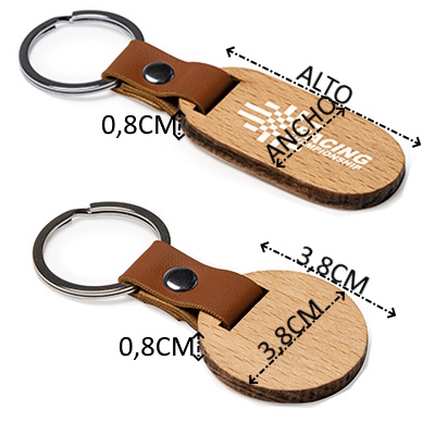 Llavero de madera natural en dos formatos, redondo y ovalado, con terminaciones en elegante polipiel y remaches efecto metalizado.
