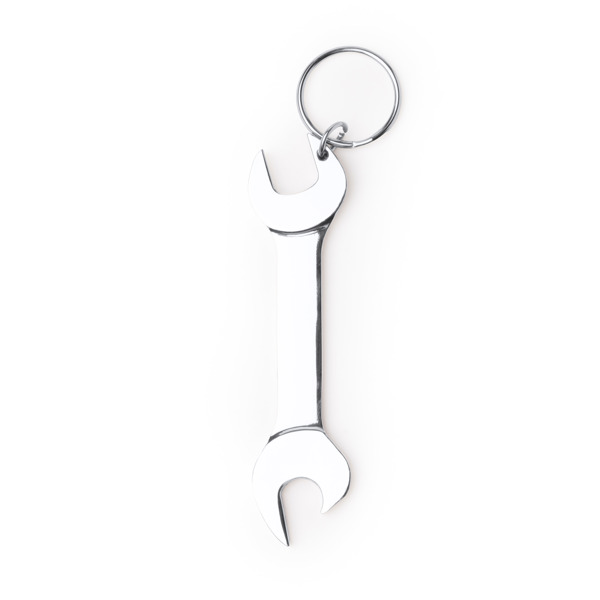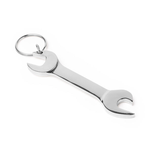 Llavero con forma de llave inglesa elaborado en metal con función abridor.