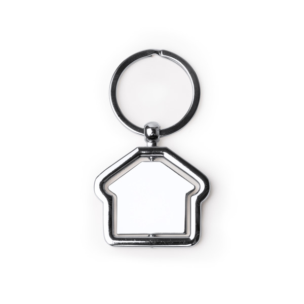 Llavero metálico giratorio con cuerpo con forma de casa también giratoria en su eje vertical. El llavero está formado por un marco fijo y por una amplia zona diseñada para el marcaje de tu marca que gira dentro del marco.