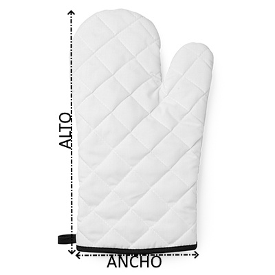 Manopla de cocina en poliéster. Acabado en color blanco con bordes y cinta para colgar en color. Cara lisa ideal para sublimación. Idónea manopla para el uso diario.