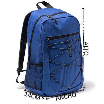 Mochila deportiva realizada en poliéster 600D. Cuenta con cierre de cremallera en el compartimento principal y en el frontal. Además de un compartimento de cuerda elástica frontal con bolsillos laterales de rejilla para el transporte de botellas u otros enseres. Con espalda y tiras acolchadas.