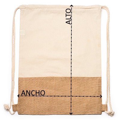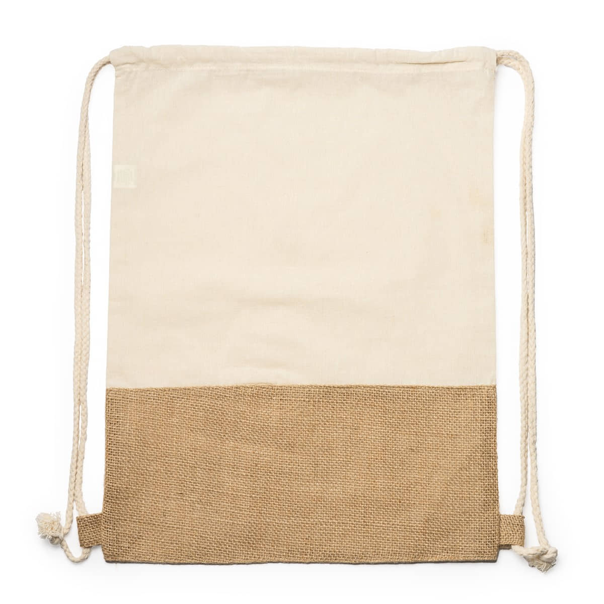 Mochila de cordones elaborado en algodón de 120 g/m² y yute en color natural. El frontal de la mochila presenta una banda de yute en la parte inferior. Cordones cosidos a ambas esquinas inferiores.