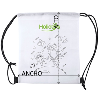 Mochila infantil de cuerdas realizada en non-woven, con diseño para colorear. Incluye 5 ceras en colores variados.