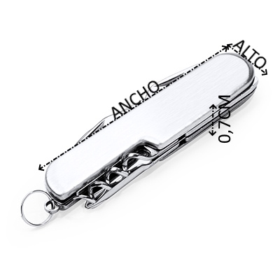 Navaja multiusos de acero inoxidable con 6 funciones: cuchillo, abridor, abrelatas, descorchador, destornillador y llavero.