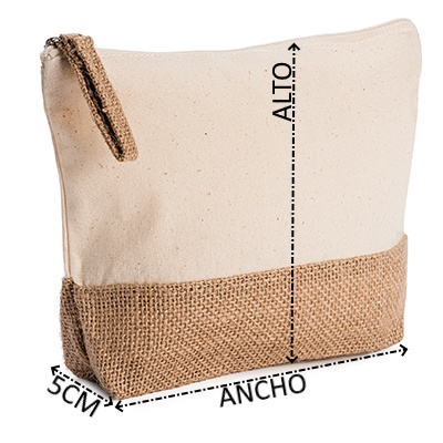 Neceser línea eco de algodón de 180 g/m² y yute en color natural. Base y tirador en yute. Cremallera con tirador de yute a juego.