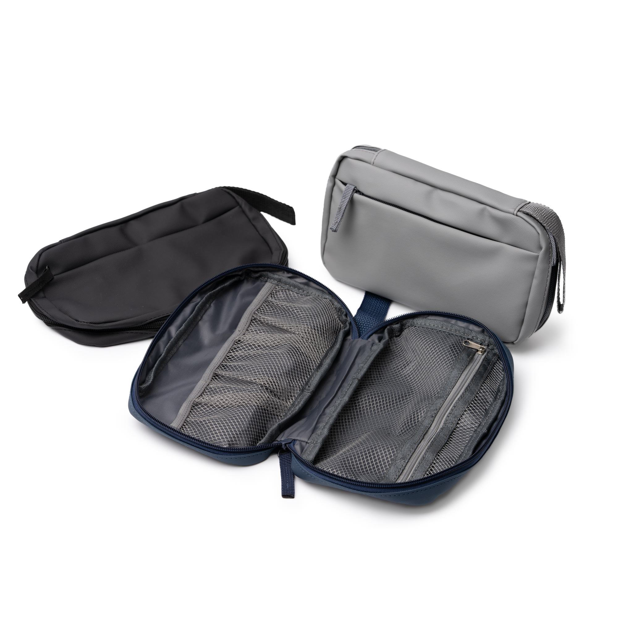 Neceser elaborado en poliuretano de apertura completa con cremallera. Cuenta con dos compartimentos interiores de malla: uno con cierre de cremallera y otro subdividido en bolsillos más pequeños. Incluye un bolsillo frontal con cierre de cremallera. Los tiradores de las cremalleras y la cinta de transporte están realizados a a color a conjunto del cuerpo.