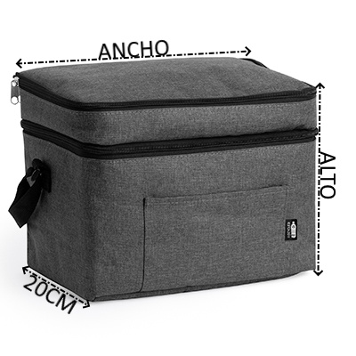 Nevera XL de poliéster reciclado RPET con diseño vigoré. Doble compartimento y bolsillo frontal para el almacenamiento de utensilios y alimentos más pequeños. Interior isométrico. Más capacidad, junto a su cinta ajustable, para llevar la comida y bebida de manera más cómoda.