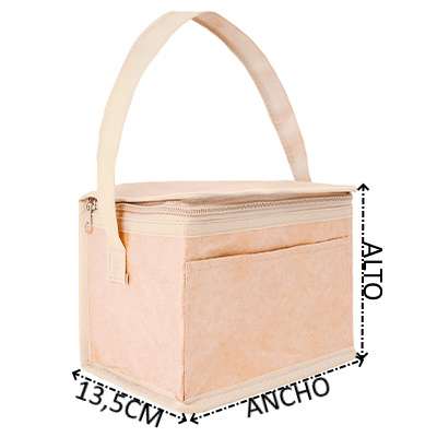 Nevera de papel kraft laminada, con interior isotérmico de aluminio y espuma aislante de 2 mm, permitiendo mantener los alimentos y bebidas en una temperatura perfecta. Cuenta con una solapa con cierre de cremallera y práctica asa de mano para transporte.