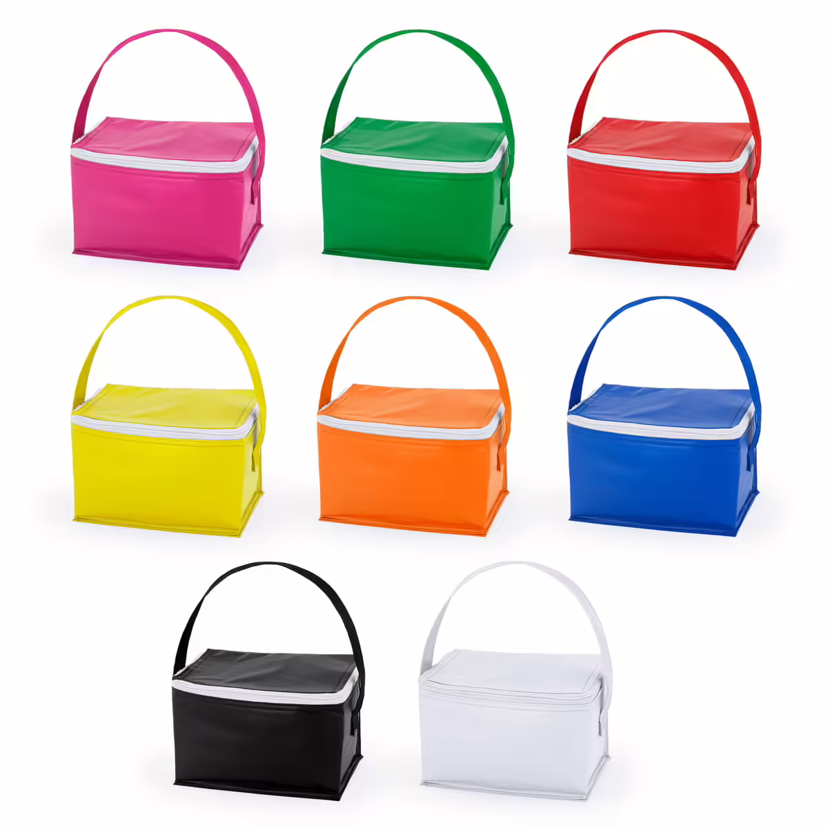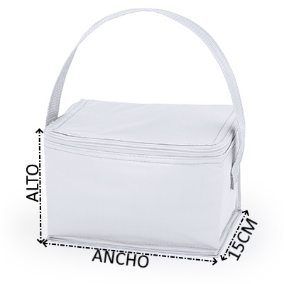 Nevera con interior isotérmico de aluminio para 6 latas. Exterior en resistente PVC. Asa de transporte a juego y cierre de cremallera.