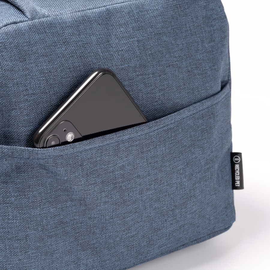 Nevera realizada en 600D RPET con un compartimento principal con interior isotérmico para el almacenaje de bebidas y alimentos a la temperatura óptima. Cuenta, además, con un bolsillo frontal para el almacenaje de utensilios y pequeños snaks, además de asas redondas acolchadas para mayor versatilidad en su transporte.