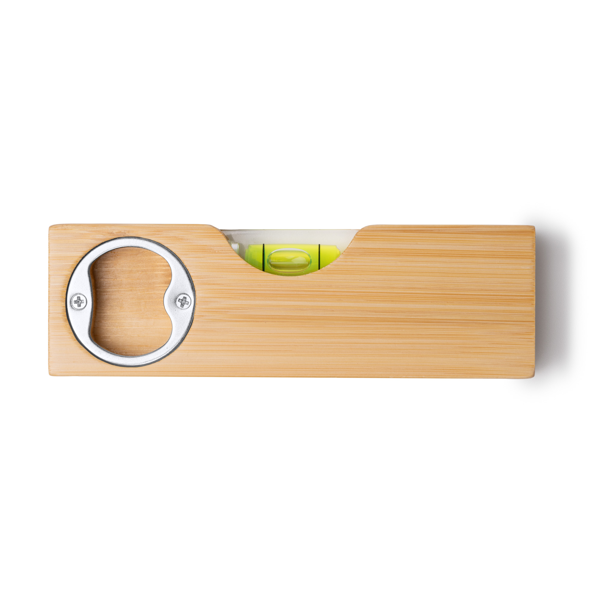 Nivel de burbuja elaborado en bambú con abridor metálico incorporado en el cuerpo.