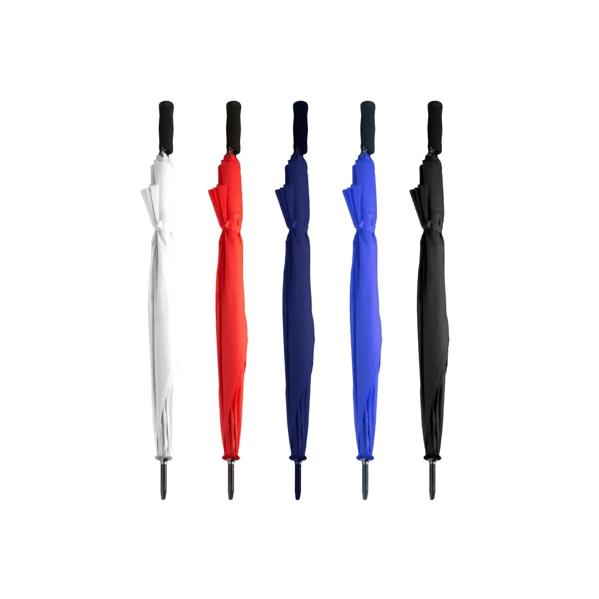 Paraguas antiventiscas XL con mango, bastón y terminaciones en negro. Cuenta con varillas largas de fibra de vidrio y botón de apertura automática. Mango recto de goma EVA, lo que proporciona comodidad en el agarre. Con cierre con velcro en color a juego con la tela del paraguas. Diámetro 130, que lo dota de amplitud extra.
