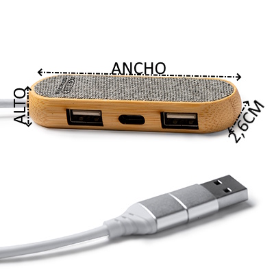 Puerto USB con cuerpo elaborado en bambú y tejido RPET. Incluye salida USB con adaptador incorporado a Tipo C. Con 2 puertos USB y USB tipo C.