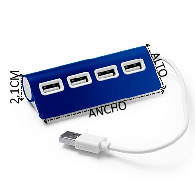 Puerto USB HUB 4 en 1, con cuerpo elaborado en aluminio, acabado bicolor. Incluye 4 puertos USB de salida. Cable blanco de conexión USB blanco incorporado.