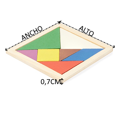 Puzzle Tangram realizado en madera natural con 7 piezas a color. Ideal para el desarrollo de habilidades.