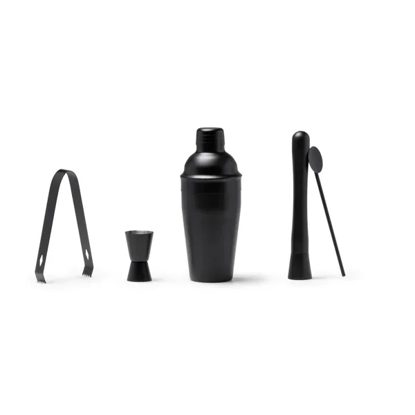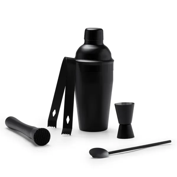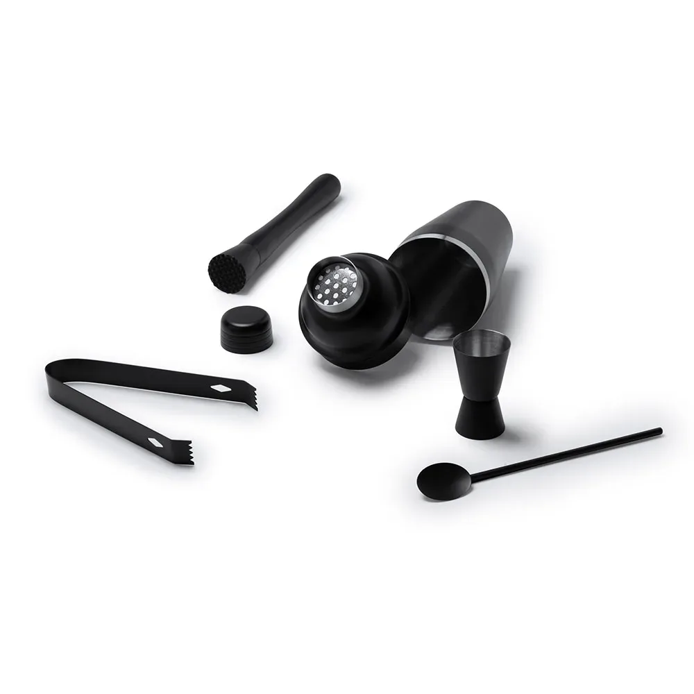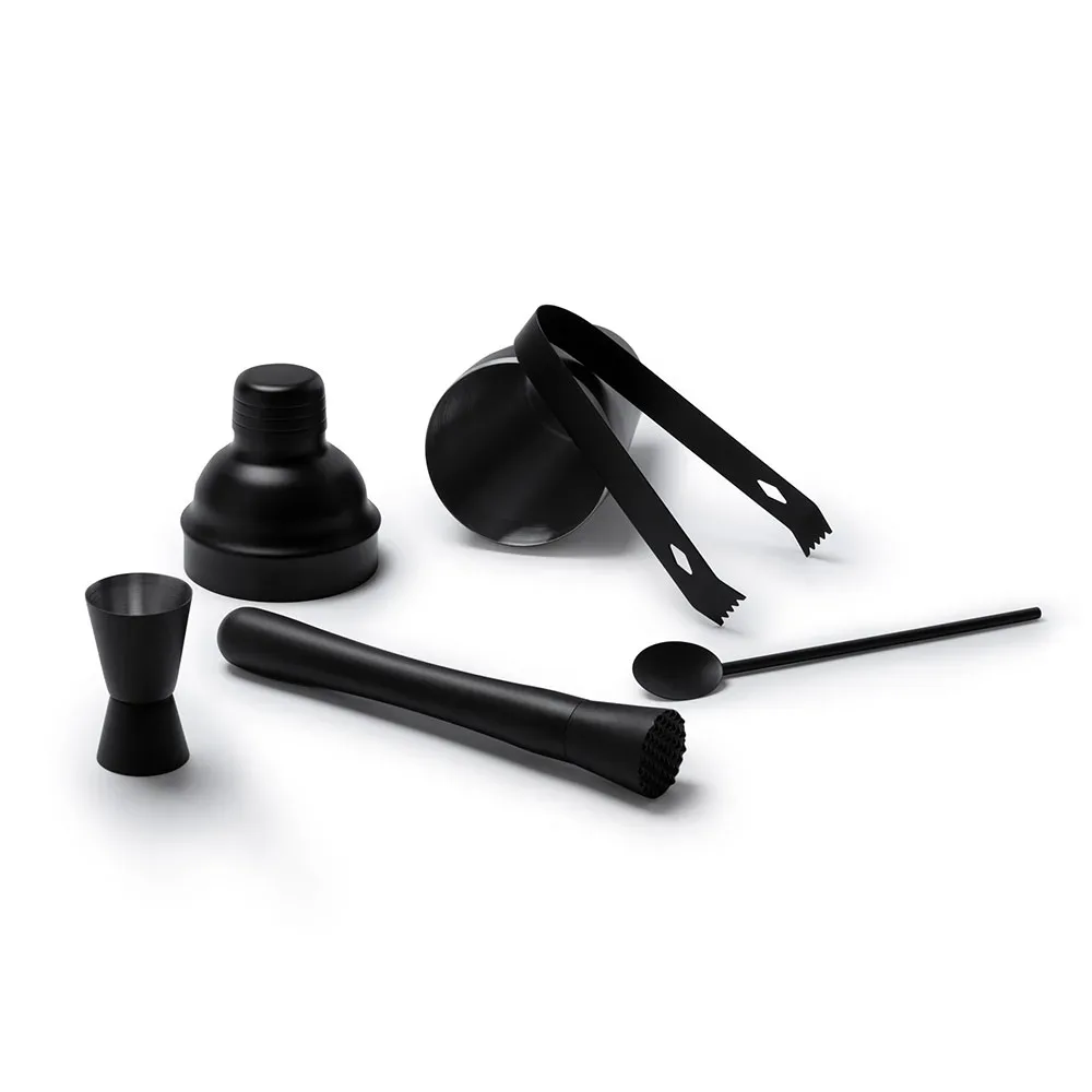 Set de cóctel de acero inoxidable 304 en color negro. Incluye un vaso medidor, coctelera de 550ml, pinzas, cuchara y mortero. Un set completo para preparar tus mejores cócteles.