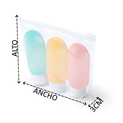 Set de tres envases especialmente diseñados para utilizar en viajes gracias a su pequeño formato. Cada botella es de un color, facilitando la distinción de los productos que contienen. Además, incluye un neceser transparente para su cómodo transporte.