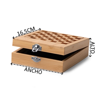 Set de vino presentado en caja de bambú diseñada con un tablero de ajedrez. El set incluye 4 accesorios: sacacorchos con abridor, dosificador, tapón y recogegotas para la botella, todos ellos elaborados en acero inoxidable con detalles en bambú. Incluye las piezas del ajedrez.