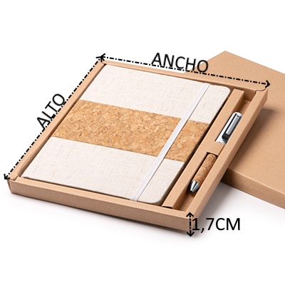 Set libreta A5 y bolígrafo presentados en un estuche de cartón kraft. Libreta con tapa rígida de algodón y corcho con 80 hojas rayadas. Bolígrafo metálico con empuñadura de corcho. Tinta azul.