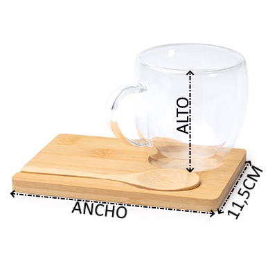 Set compuesto por taza de cristal borosilicato de doble pared, posavasos rectangular y cuchara elaborados en bambú. La taza aísla el calor gracias a su doble pared y hace más cómodo su uso, además de contar con una capacidad de hasta 250 ml.