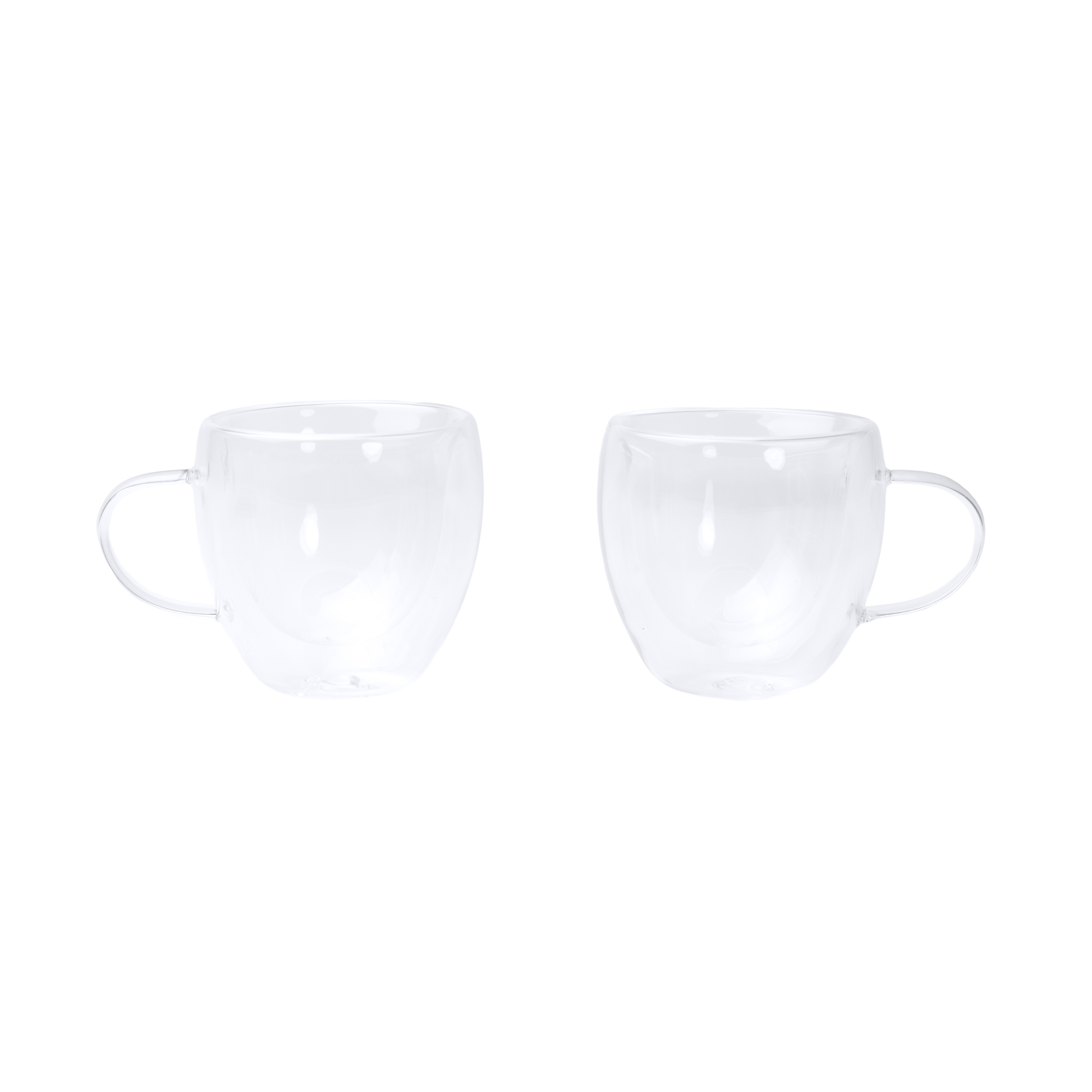 Set de café compuesto por 2 tazas de cristal de doble pared con un posavasos invididual cuadrado elaborados en bambú para cada una. Cada taza aísla el calor gracias a su doble pared, haciendo más cómodo su uso. Cada taza cuenta con una capacidad de 90 ml.