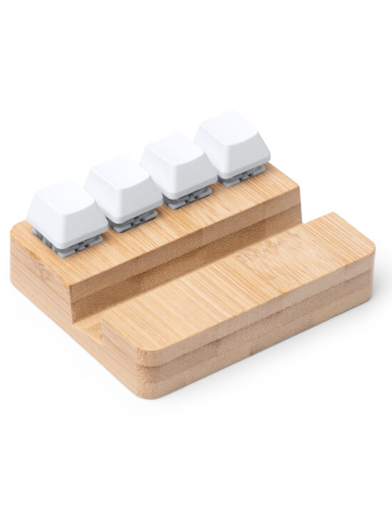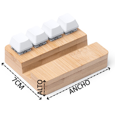 Soporte para smartphone con función antiestrés elaborado en bambú. Su diseño cuenta con cuatro botones tipo teclado que puedes pulsar y utilizar como medio antiestrés.