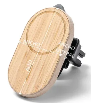 PRODUCTO QUE SE DESCATALOGARÁ CUANDO SE AGOTEN LAS EXISTENCIAS – Soporte de coche con función magnética para Smartphone y cargador inalámbrico. Fabricado en bambú y fibra de trigo. Cuenta con función de carga inalámbrica, rotación de la base en el soporte, con sujeción adaptable. Compatible con dispositivos provisto de tecnología de carga inalámbrica. Incluye un martillo de emergencia para romper cristales, corta cinturones y cable Tipo C de conexión junto con anilla metálica. Presentación en caja diseño eco.