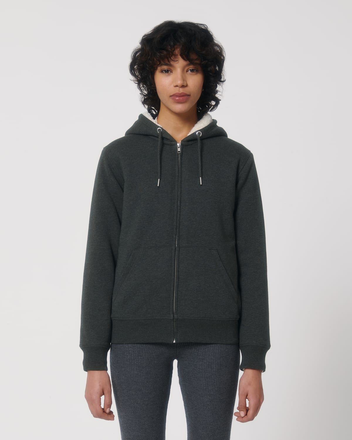 LA SUDADERA UNISEX CON CREMALLERA FORRADA CON BORREGUILLO Manga pegada Capucha forrada de borreguillo reciclado Cordón redondo en el mismo tono rematado con extremos de acabado metálico Ojales de metal Bies interior greige de espiga en el cuello Media luna del tejido principal en la zona trasera del cuello Cremallera central delantera metálica cubierta Canalé 1×1 en puños y bajo Sisas, puños y bajo con pespunte doble Bolsillo canguro en la parte delantera Totalmente forrada con borreguillo reciclado Bolsillo interior en el pecho Cremallera interior invisible en el bajo para ajustar a medida
