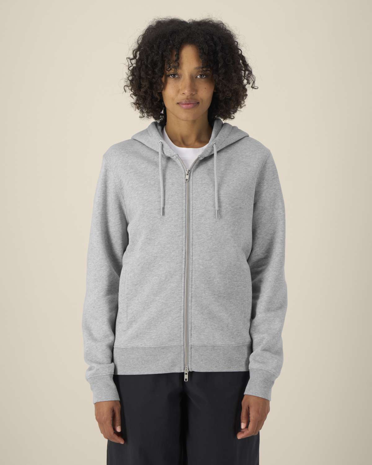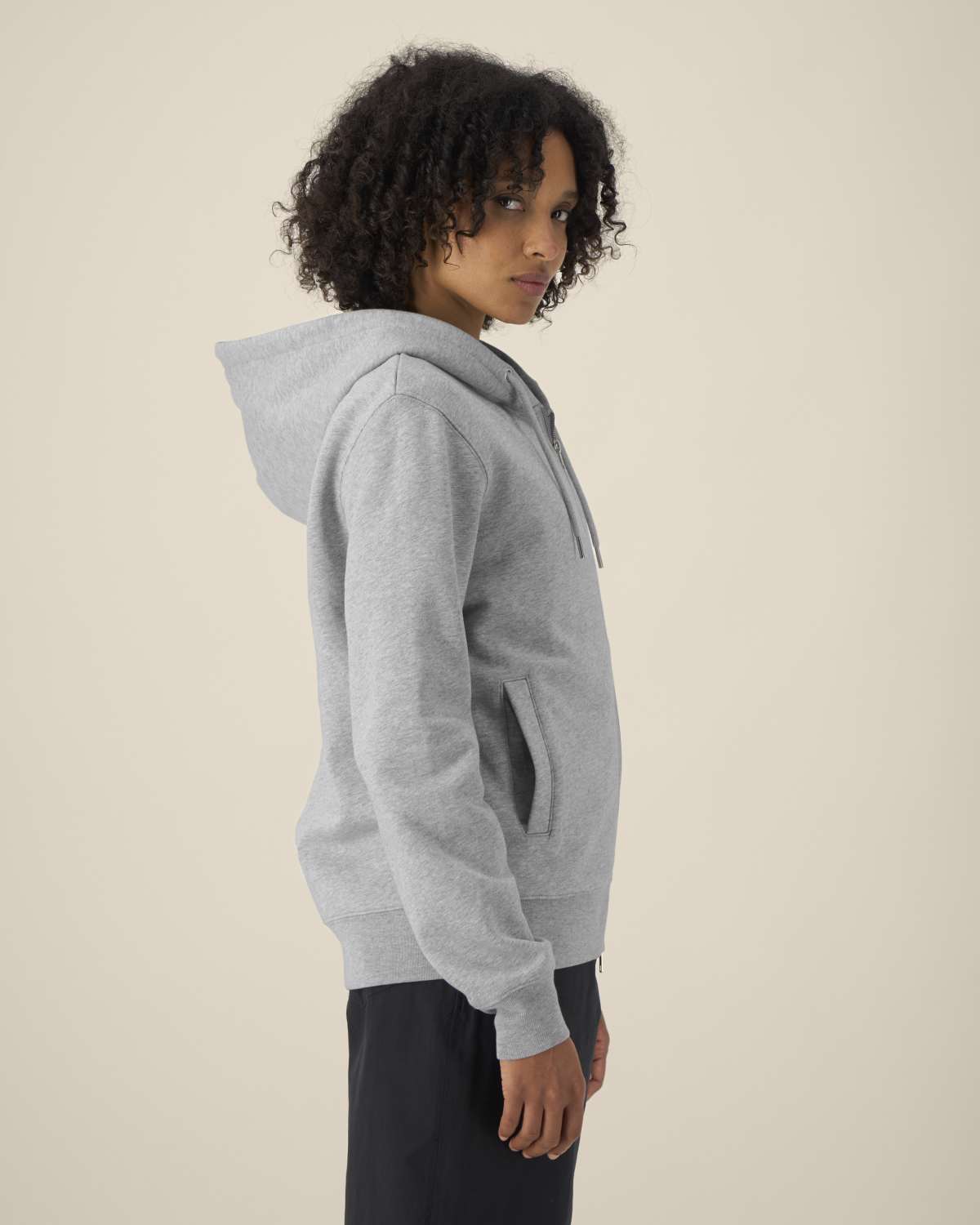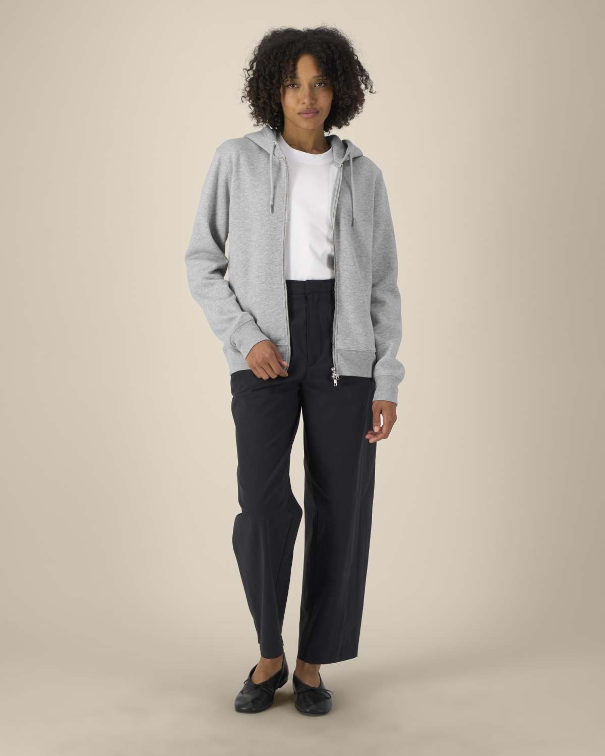 La sudadera con capucha y cremallera unisex de algodón-TENCEL™ Modal. Capucha forrada del mismo tejido con cordón redondo al tono y puntas metálicas cerradas, ojales metálicos. Manga montada. Cremallera central delantera de doble carro. Bolsillos de ojal. Canalé 1×1 en puños y bajo. Cinta de refuerzo interior en el cuello con dibujo de espiga. Media luna del mismo tejido en la parte trasera del cuello. Acabados cuidados para mayor durabilidad y confort.