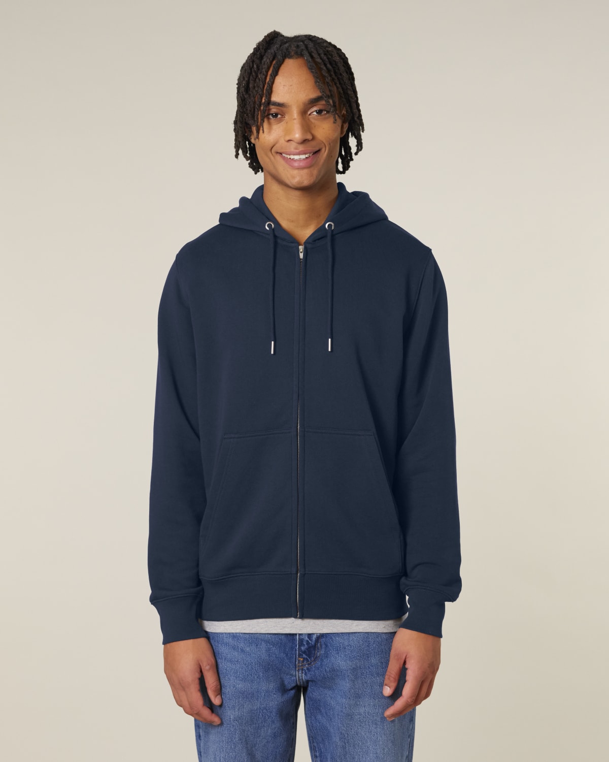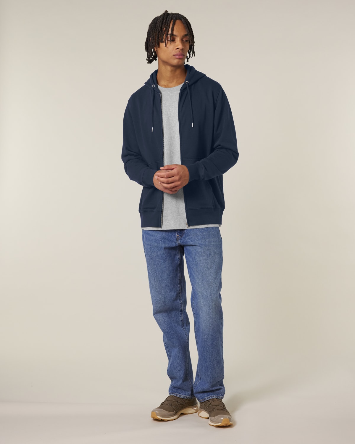 Mangas montadas Capucha forrada con la misma tela Cremallera metálica cubierta en el centro delantero Cordones redondos del mismo color del cuerpo con acabado metálico cerrado Ojales metálicos Ribete de 1×1 en puños de las mangas y dobladillo inferior Bolsillo canguro Costura de doble aguja en sisa, puños de las mangas y dobladillo inferior Cinta de espiga en la costura interior del cuello y dentro de la cremallera Media luna de tela de la misma en la nuca