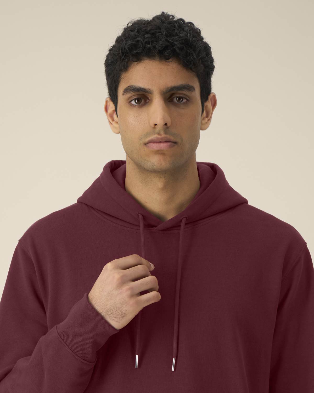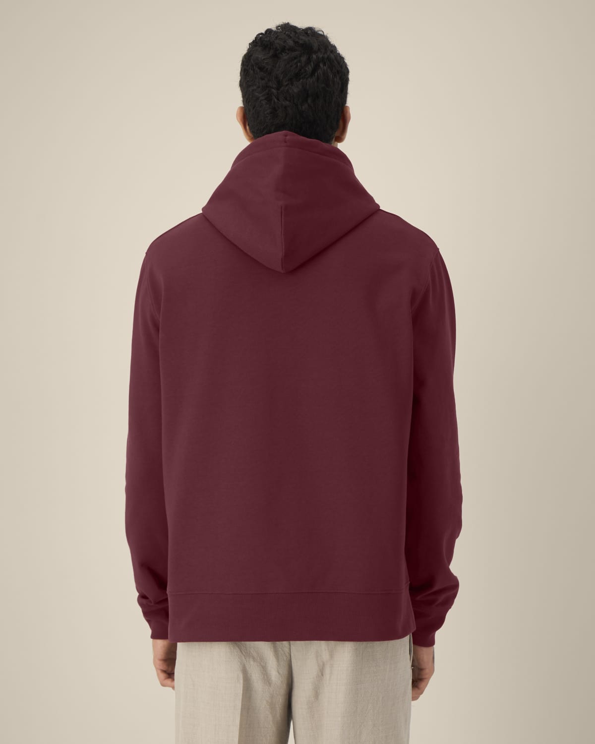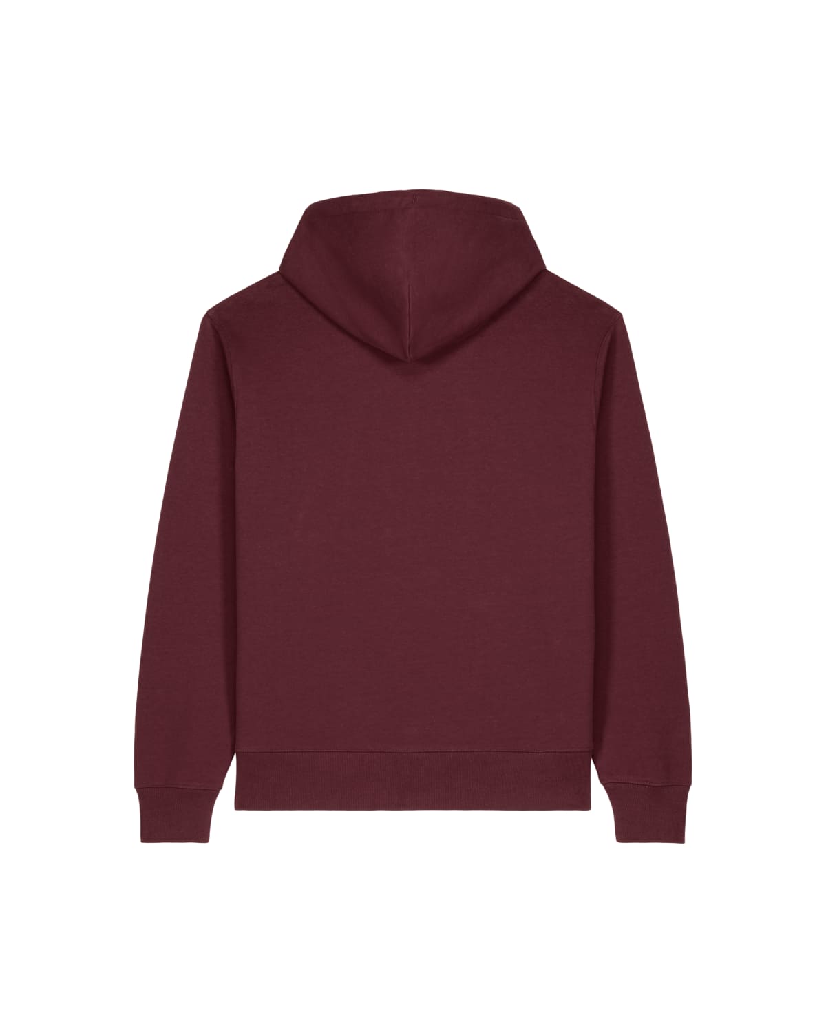La sudadera con capucha unisex de algodón reciclado. Capucha forrada del mismo tejido con cordón redondo al tono y puntas metálicas cerradas, ojales bordados. Manga montada. Bolsillo canguro. Canalé 1×1 en puños y bajo. Pespunte de doble aguja en puños y bajo. Cinta de refuerzo interior en el cuello con dibujo de espiga. Media luna del mismo tejido en la parte trasera del cuello. Acabados cuidados para mayor durabilidad y confort.