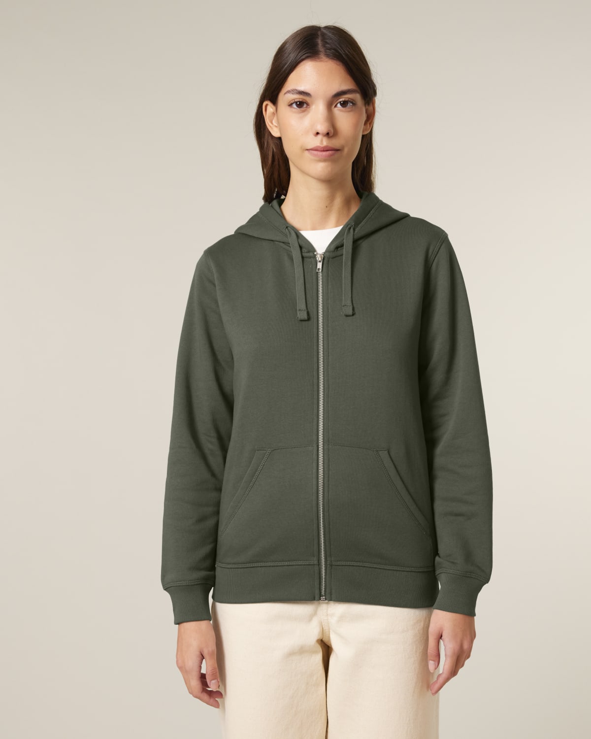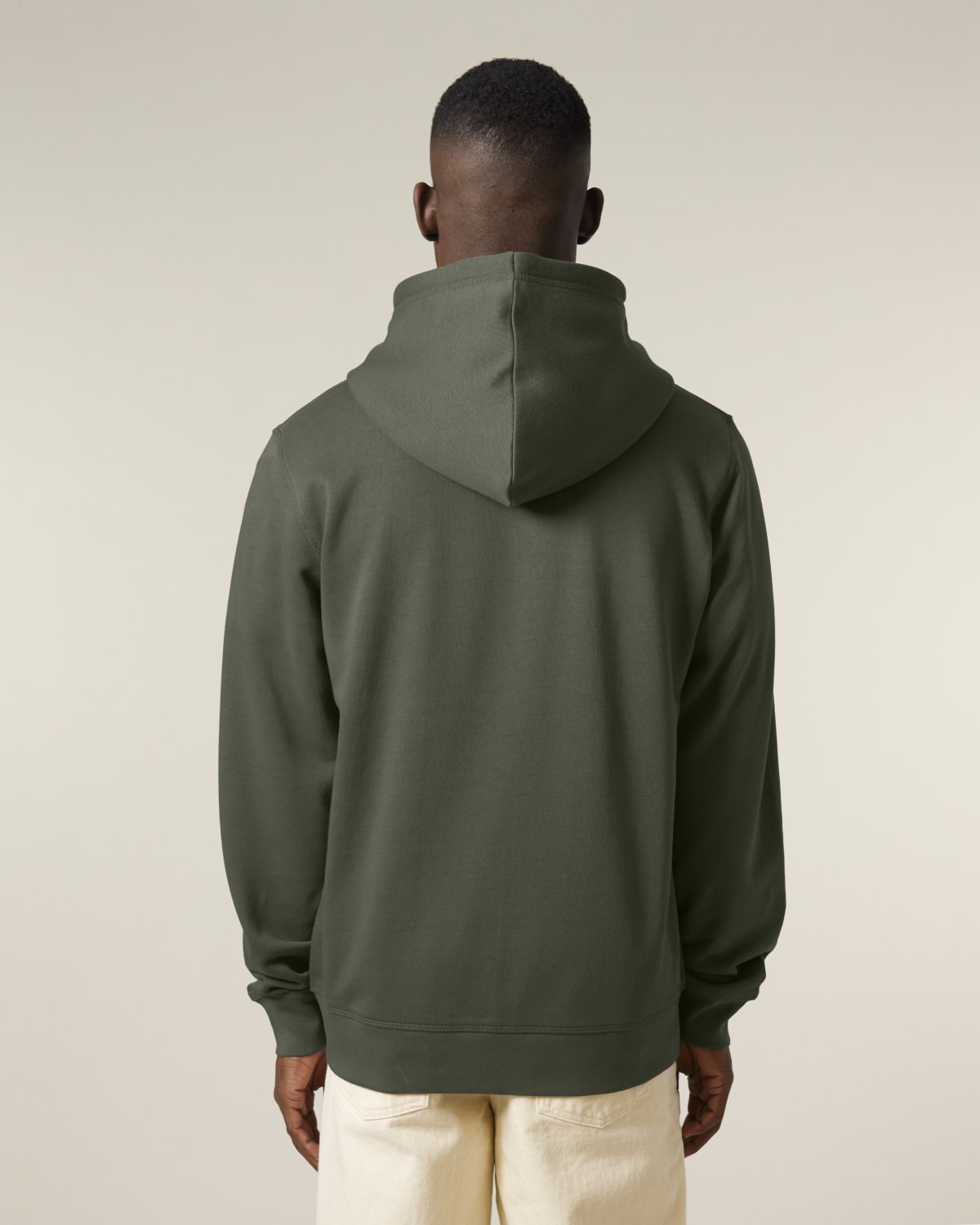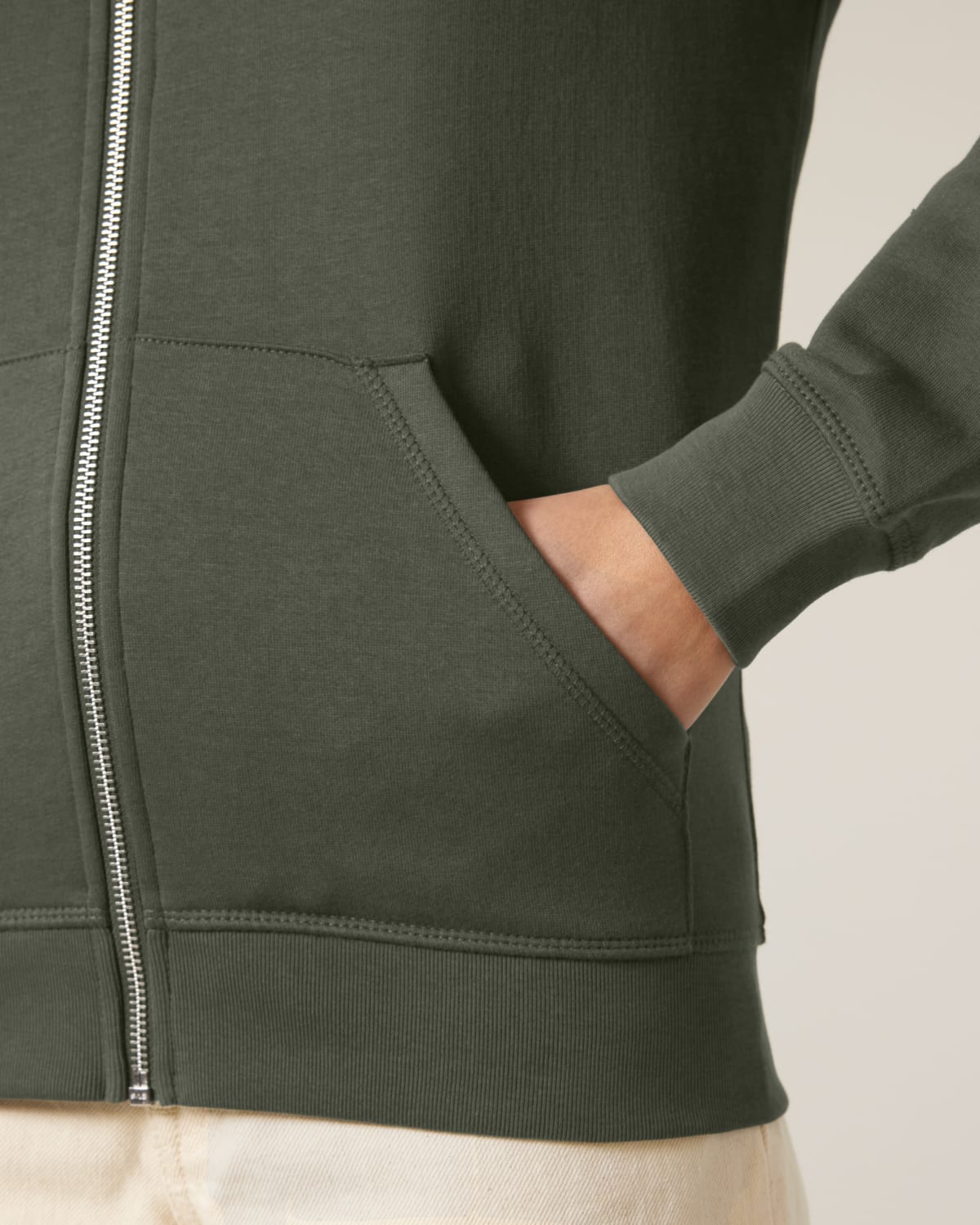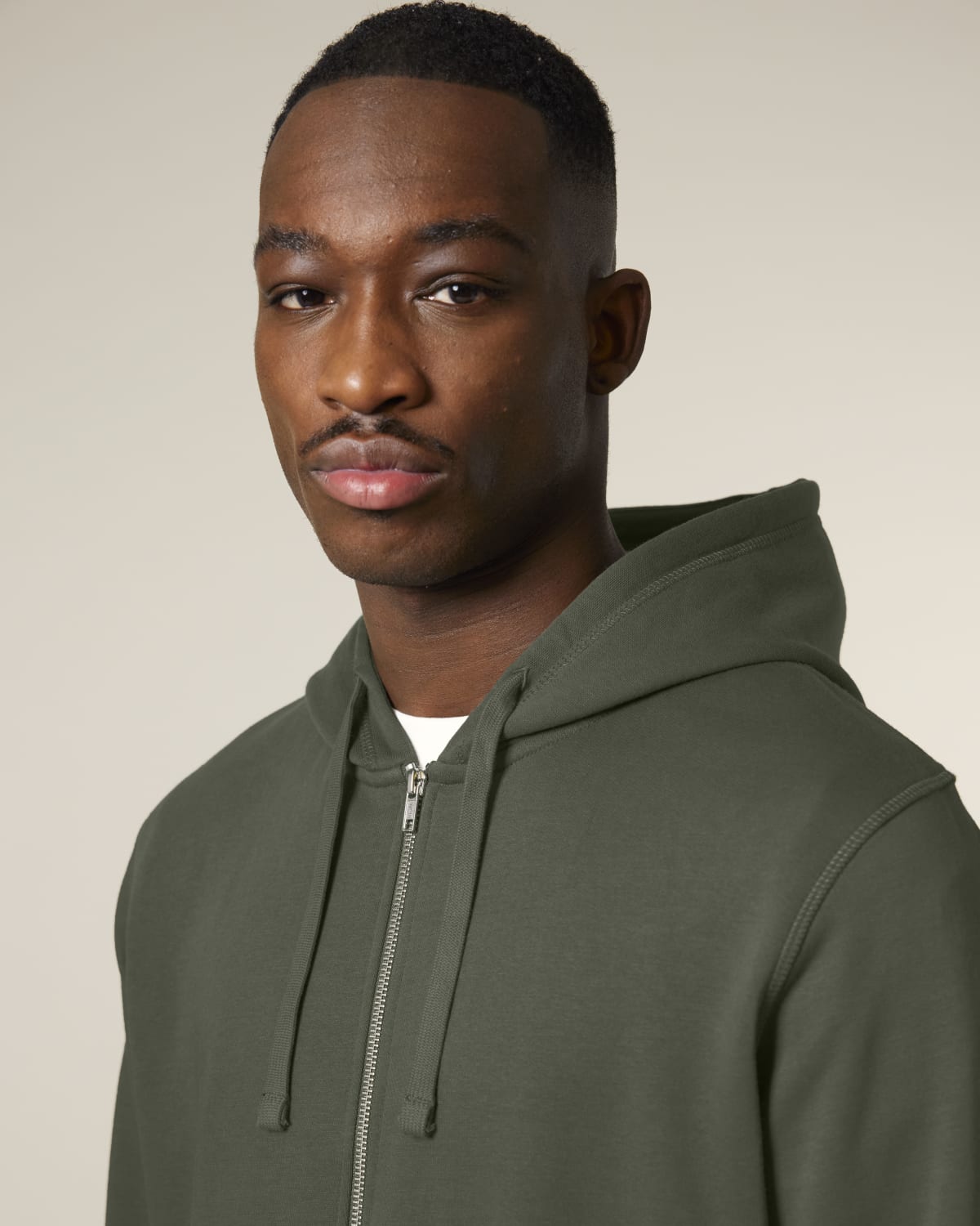 Mangas montadas Capucha forrada de la misma tela Cordones planos del mismo color que el cuerpo Ojales bordados con forma de ojal Costilla 1×1 en los puños de las mangas y el dobladillo inferior Bolsillo tipo canguro con costuras flatlock Cremallera metálica visible en el centro del frente Costuras flatlock de tres agujas en todas las costuras Cinta de espiga en la costura interior de la nuca y en el interior de la cremallera Media luna de la misma tela en la nuca