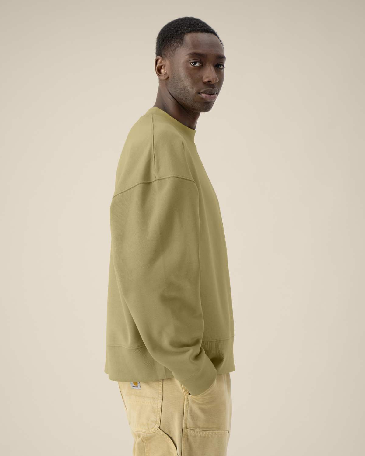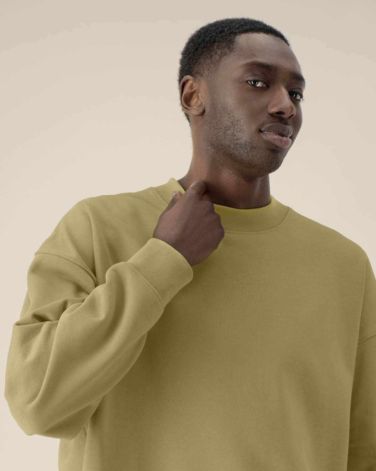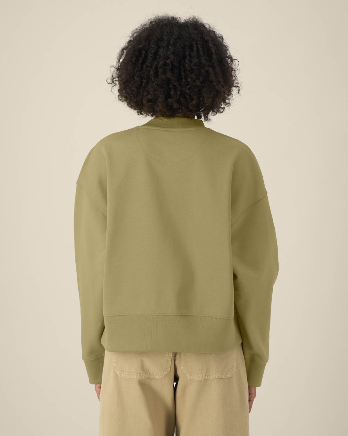 La sudadera cuello redondo unisex boxy de algodón reciclado. Manga montada. Canalé 1×1 en el cuello, puños y bajo. Pespunte de doble aguja en hombros, sisas, puños y bajo. Cinta de refuerzo interior en el cuello con dibujo de espiga. Media luna del mismo tejido en la parte trasera del cuello. Acabados cuidados para mayor durabilidad y confort.