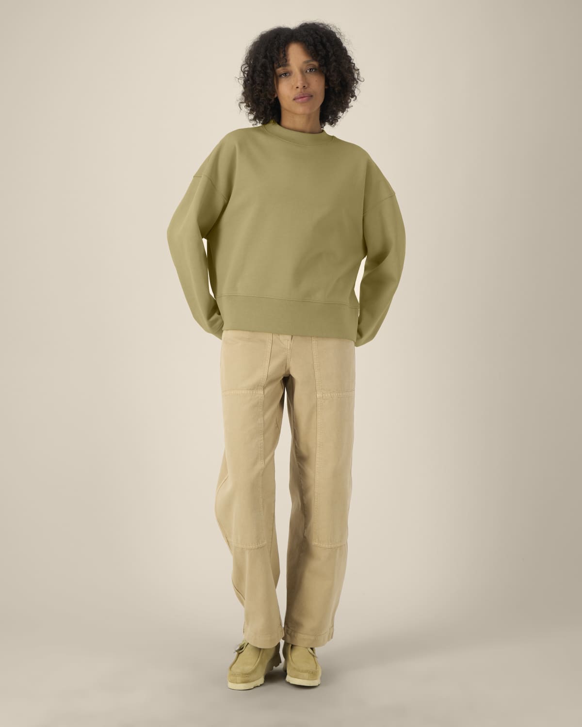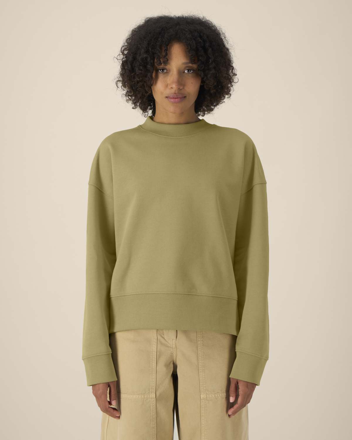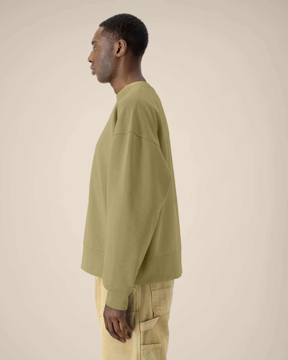 La sudadera cuello redondo unisex boxy de algodón reciclado. Manga montada. Canalé 1×1 en el cuello, puños y bajo. Pespunte de doble aguja en hombros, sisas, puños y bajo. Cinta de refuerzo interior en el cuello con dibujo de espiga. Media luna del mismo tejido en la parte trasera del cuello. Acabados cuidados para mayor durabilidad y confort.
