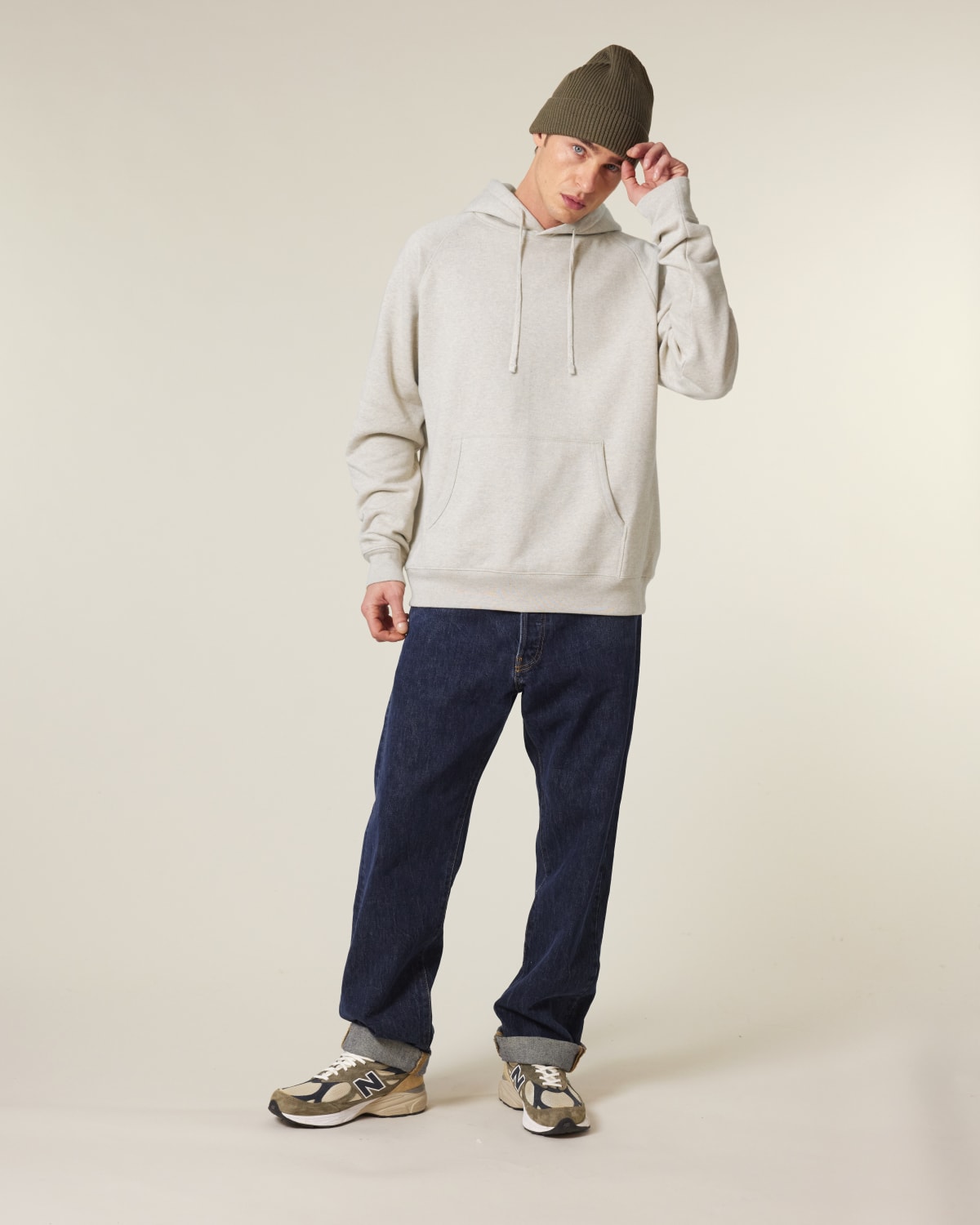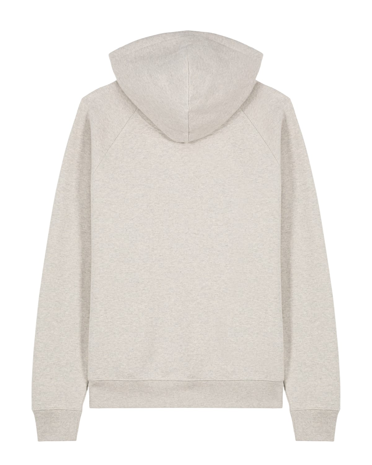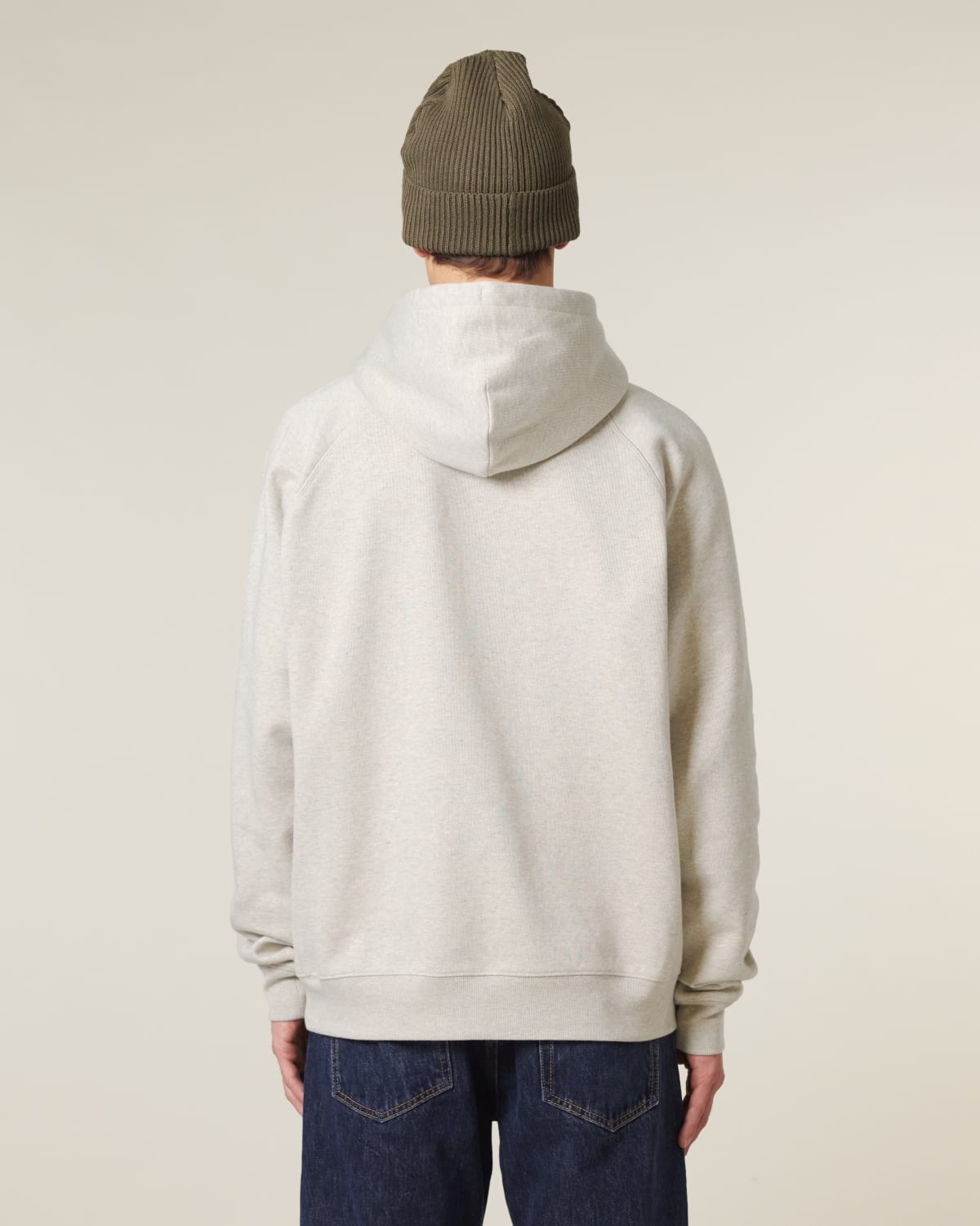 Mangas raglán Capucha de doble capa en la misma tela Bolsillo tipo canguro en el frente Costillas 1×1 en cuello, puños de las mangas y dobladillo inferior Paneles laterales de costillas 1×1 Costillas 1X1 en aberturas de los bolsillos Costura superior de doble aguja en el cuello, puños de las mangas y dobladillo inferior Costura plana de tres agujas en la costura raglán y costuras de los paneles laterales Cinta interior del cuello en espiga Media luna de la misma tela en la nuca