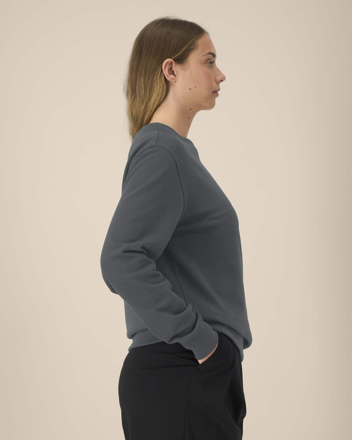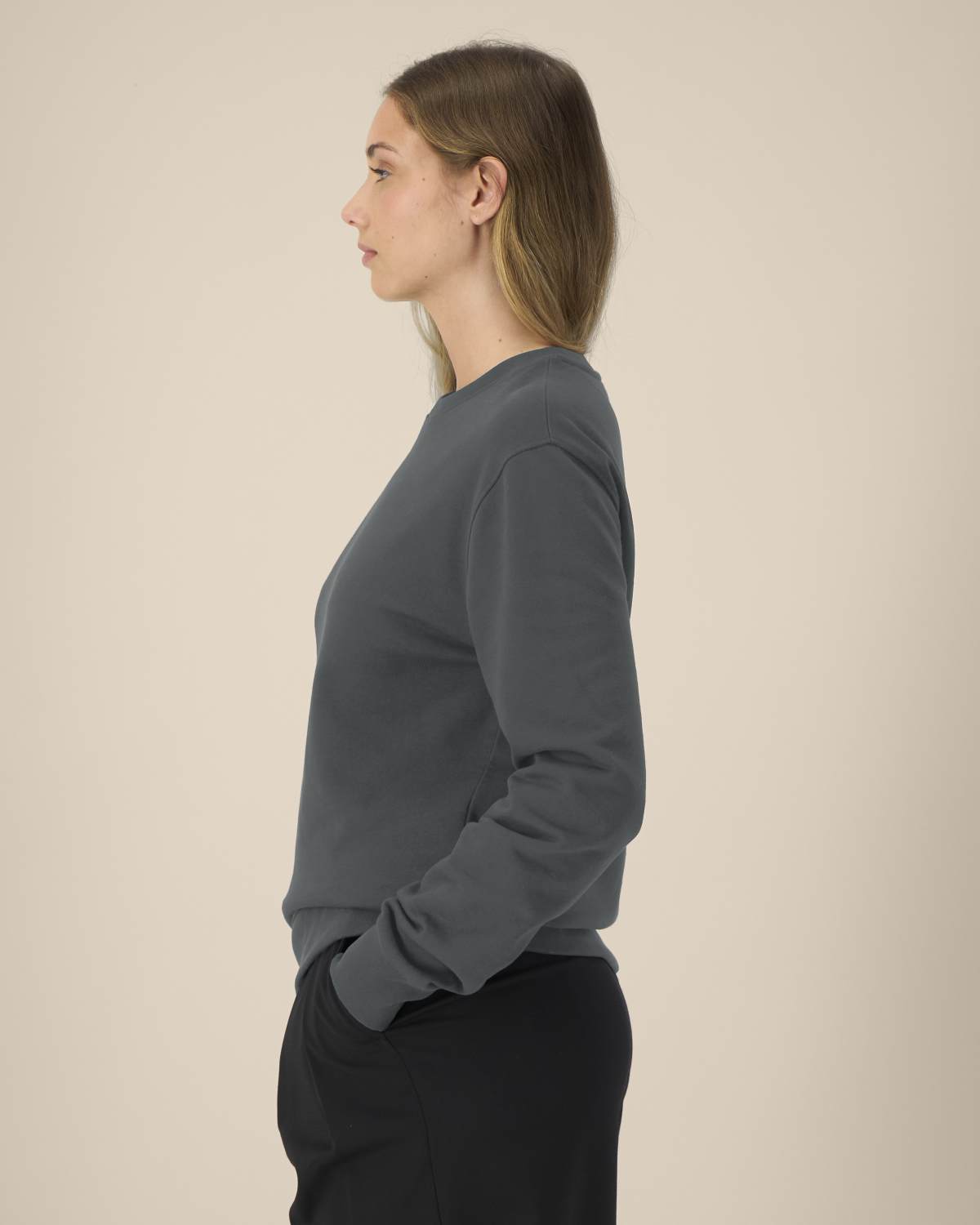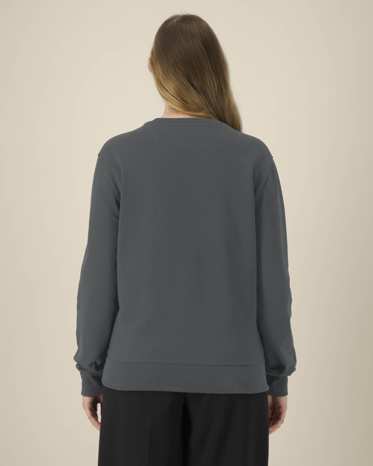 La sudadera cuello redondo unisex de algodón reciclado. Manga montada. Canalé 1×1 en el cuello. Pespunte de doble aguja en hombros, sisas, puños y bajo. Cinta de refuerzo interior en el cuello del mismo tejido. Acabados cuidados para mayor durabilidad y confort.