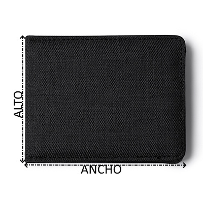 Tarjetero billetero realizado en poliéster reciclado RPET en acabado vigoré con sistema de seguridad RFID. Cuenta con 6 compartimentos para tarjetas en el interior.