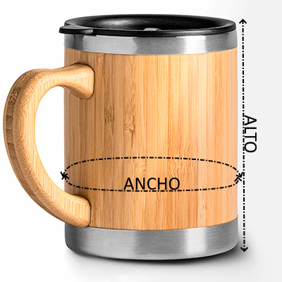 Taza de acero inoxidable con doble pared y exterior en bambú. Incluye tapa dosificadora. 340 ml de capacidad. Esta fantástica taza, es la más completa, podrás usarla tanto en casa, como fuera, todo esto combinado con un elegante diseño.