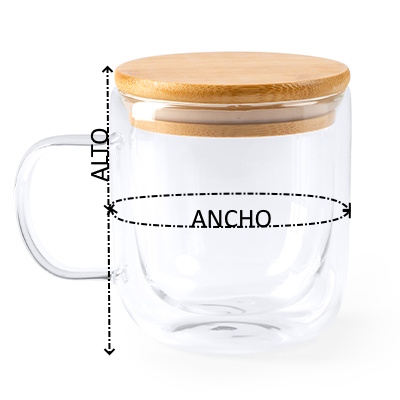 Bonita taza de doble pared realizada en cristal borosilicato con tapa de bambú. Capacidad de 280 ml.