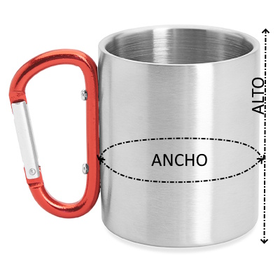 Taza metálica de doble pared con asa mosquetón ideal para transportar. Disponible en varios colores. Con capacidad 230 ml.
