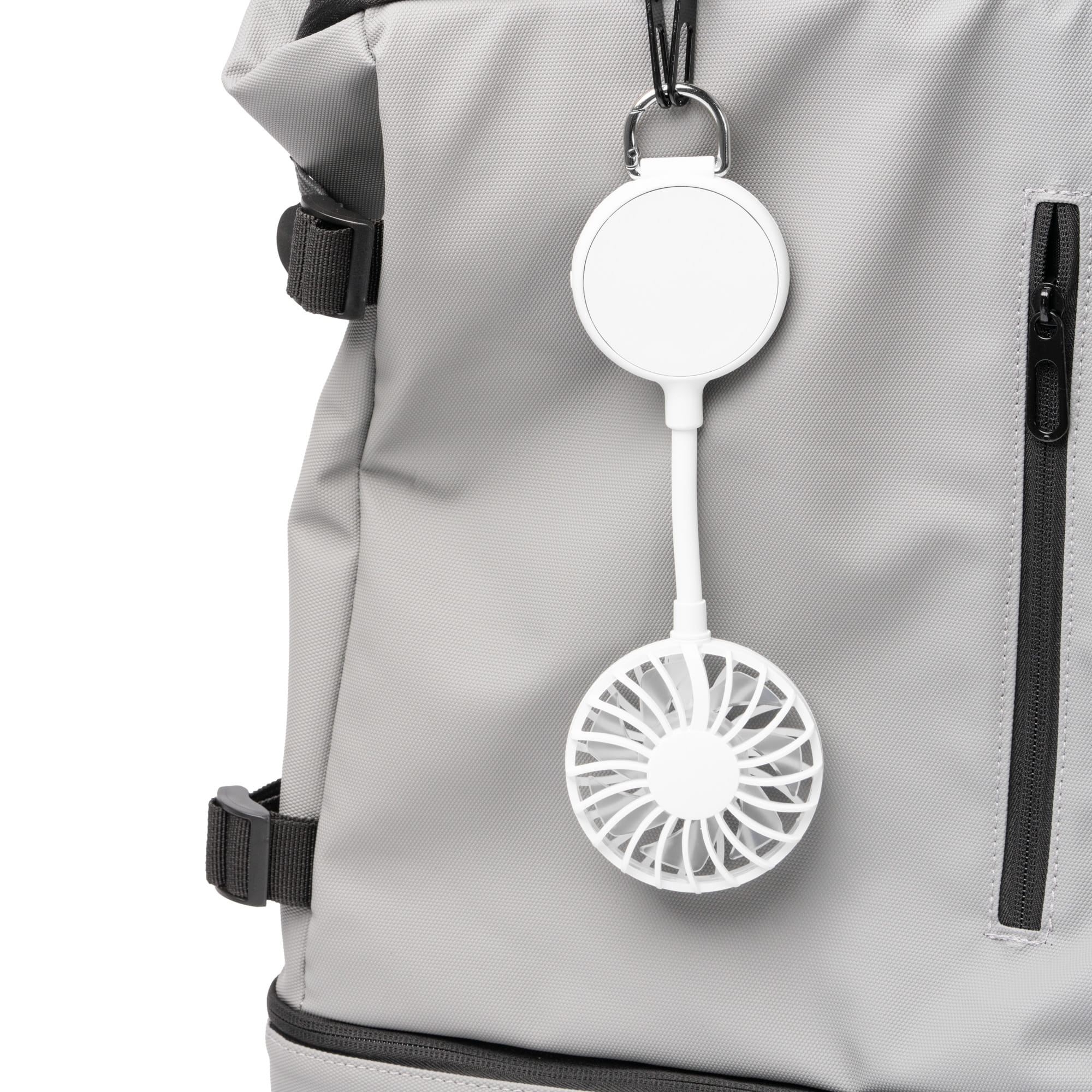 Ventilador de mano elaborado en ABS reciclado. Con batería de 500mAh recargable mediante cable. Cuenta con 3 velocidades, sistema de imán para el móvil con anillo magnético incluido. Entre sus funciones destaca su mosquetón que, además de mejorar su transporte, sirve como soporte para el móvil, que lo convierte en una opción versátil y práctica.